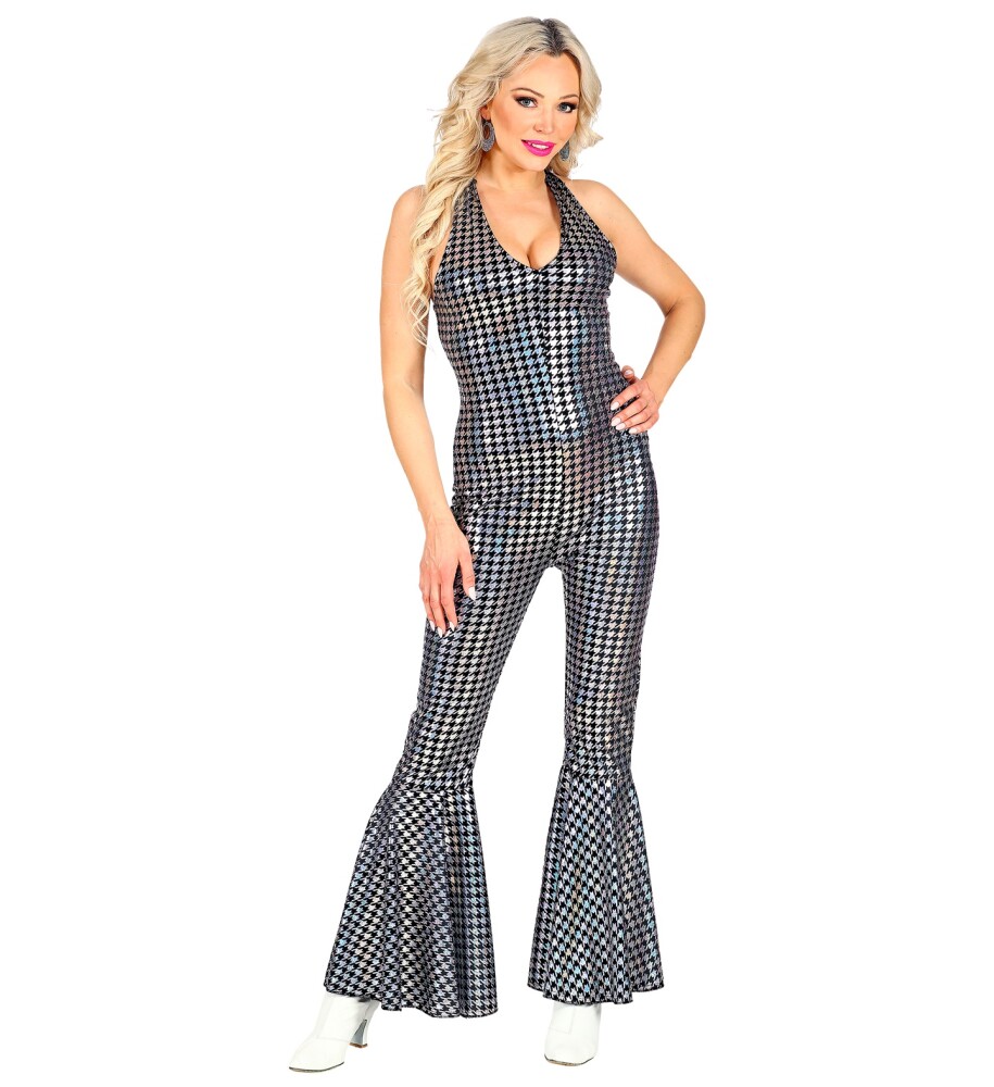 Lekker jumpsuit med stor sleng i glinsende sølv og svart mønster. Finnes i str S= ca 34/36, M= ca 38, L= ca 40 og XL= ca 42/44. Øvrig tilbehør kan kjøpes separat.