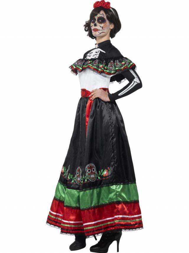 Day of the Dead Senorita-kostyme med kjole, "mock" Top, bånd og hårbånd med rose.