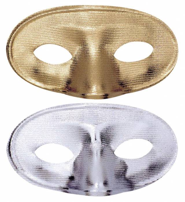 Enkel maskerademaske (dominomaske) i gull eller sølv. Skriv inn ønsket variant i kommentarfeltet til butikken ved bestilling av varen.