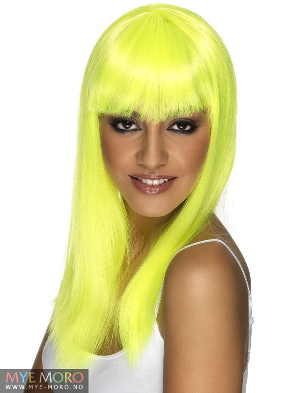 Neon GUL glam parykk med lugg. Perfekt til Disco, Abba, Mamma Mia party etc...